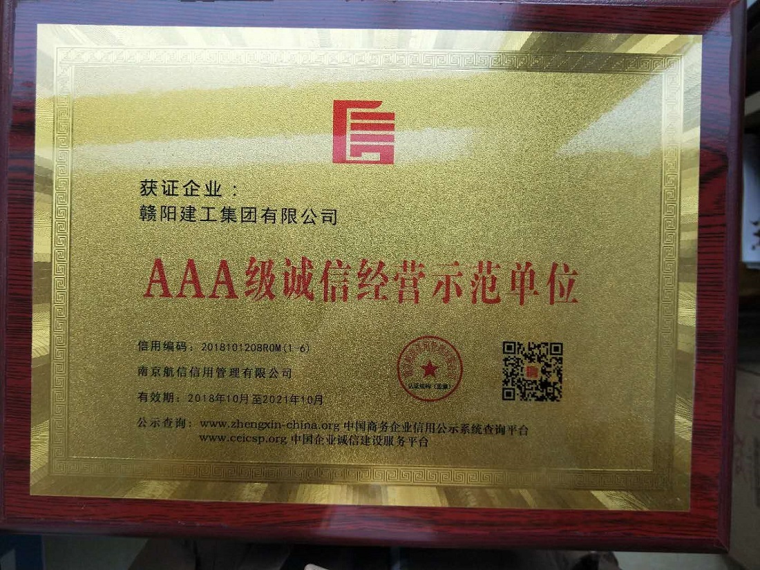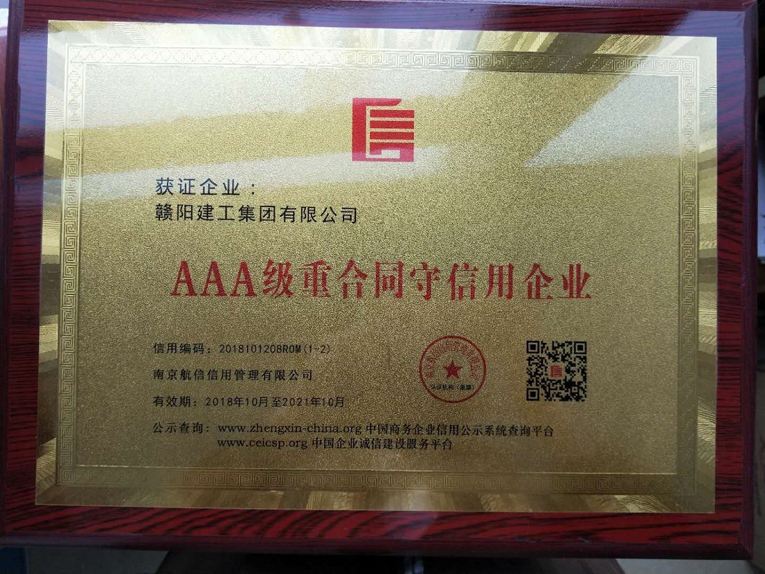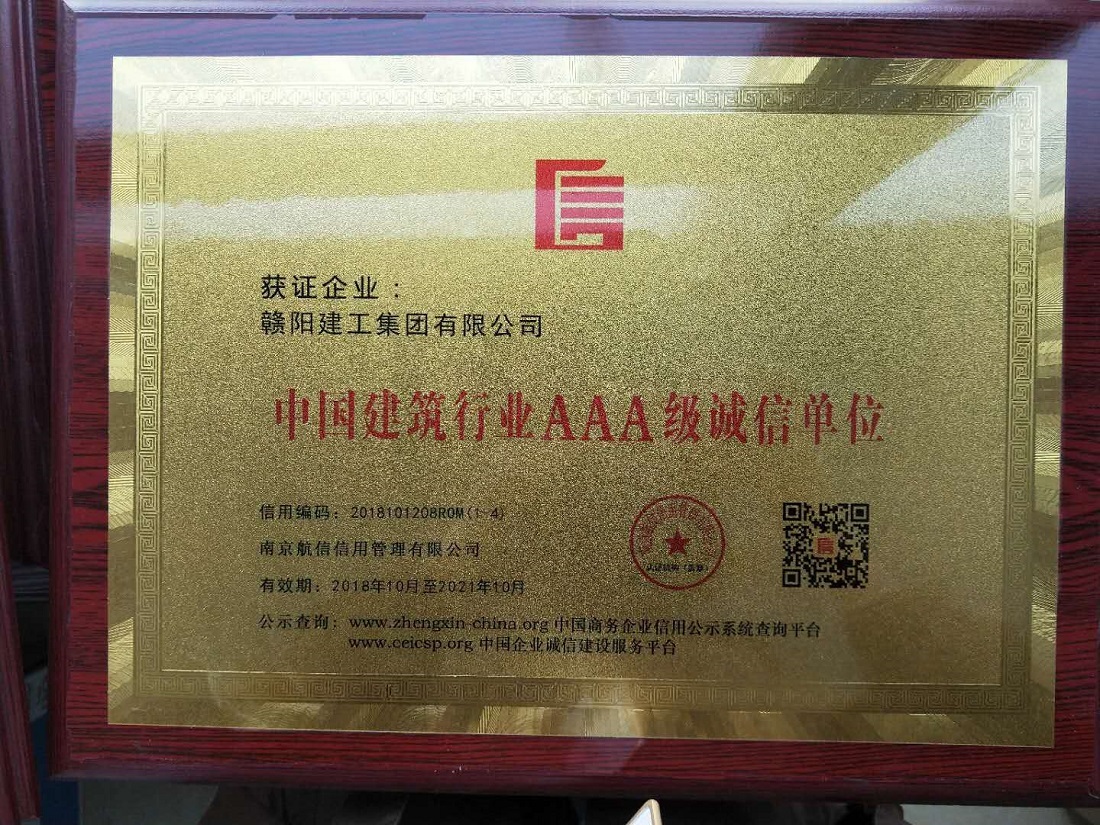 热烈祝贺赣阳建工集团荣获AAA级诚信经营示范单位、AAA级信用企业、AAA级质量服务诚信单位、AAA级重合同守信用企业、AAA资信等级、招投标企业信用评价AAA级信用企业、中国建筑行业AAA级诚信单位、中国诚信企业家等八项荣誉。