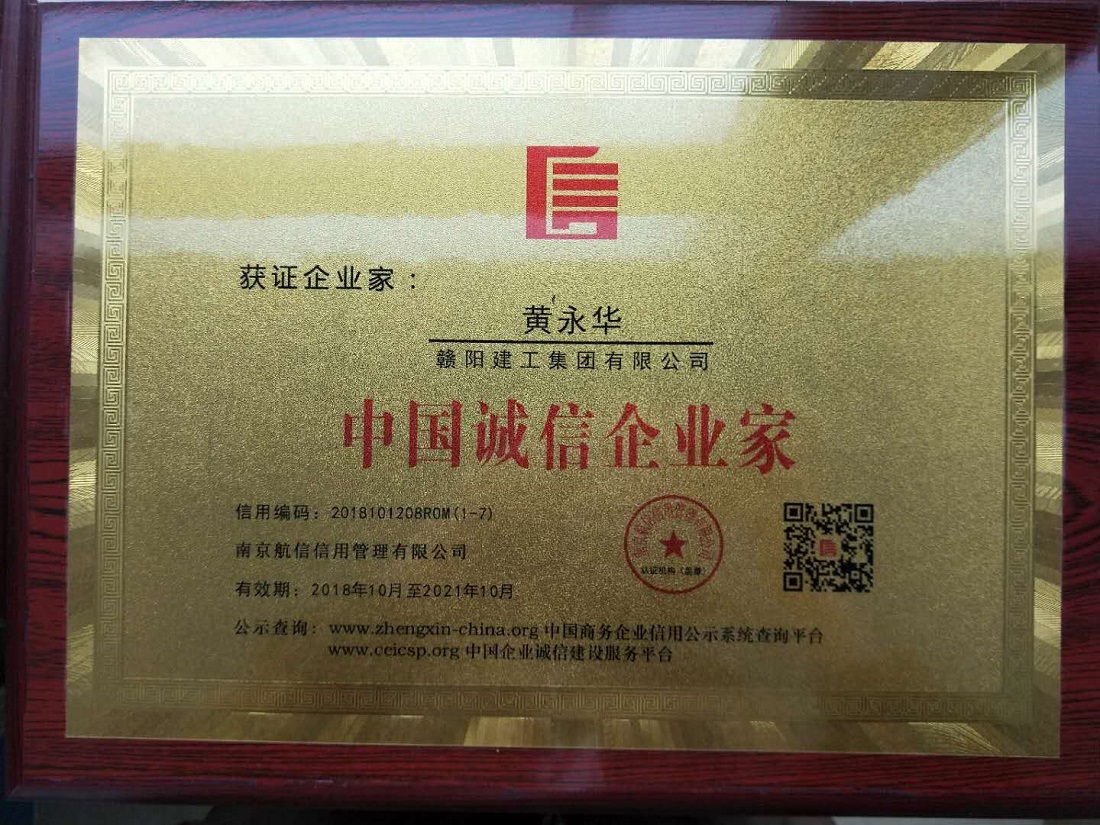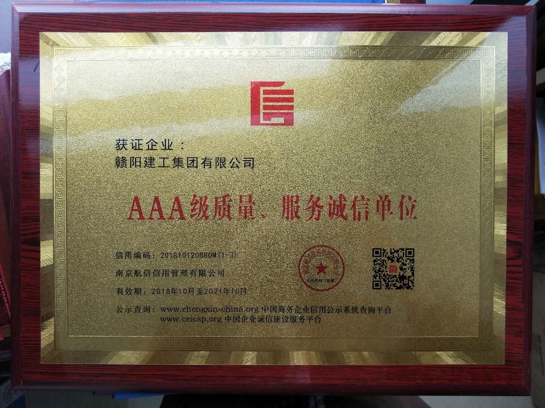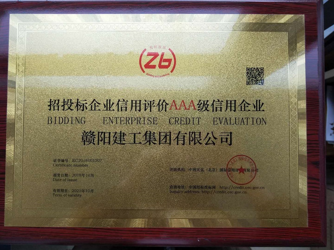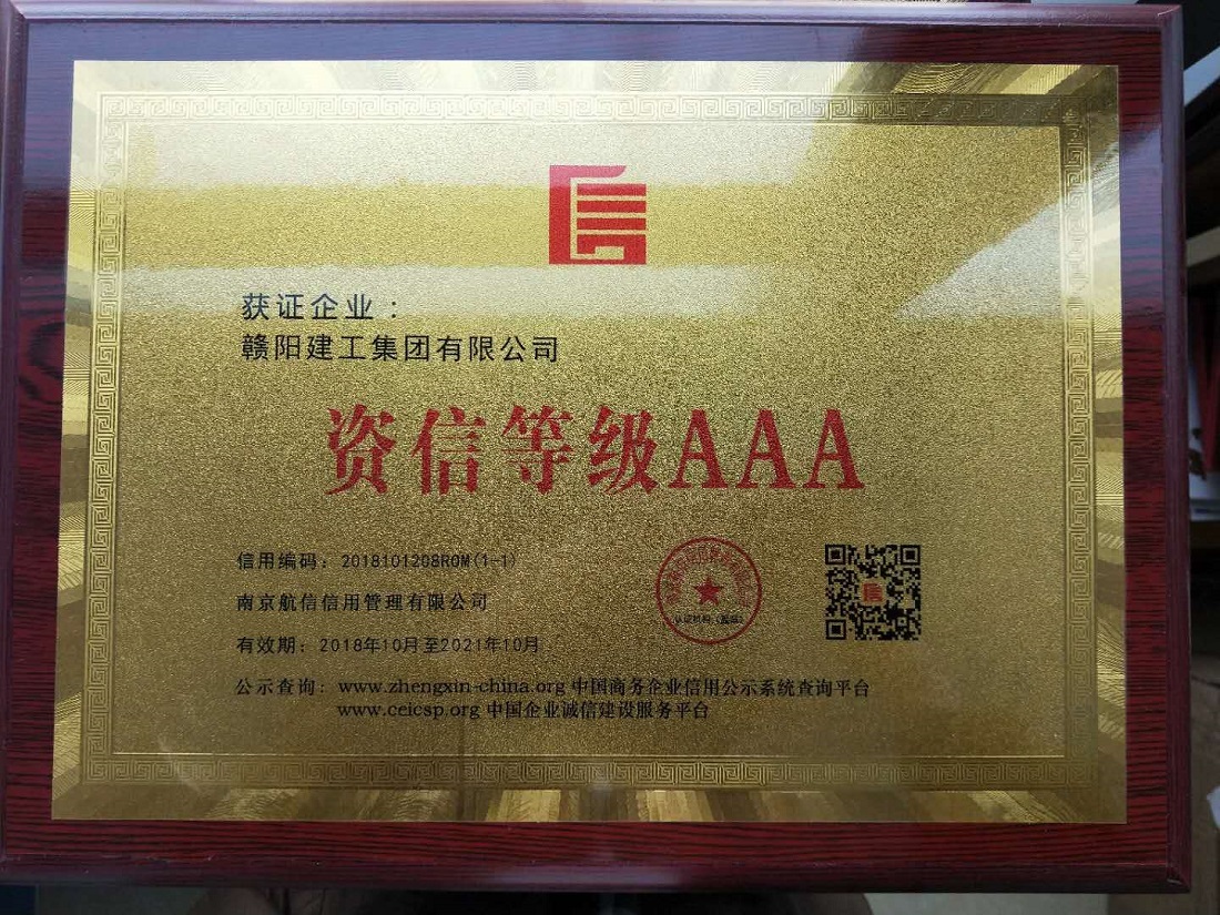 热烈祝贺赣阳建工集团荣获AAA级诚信经营示范单位、AAA级信用企业、AAA级质量服务诚信单位、AAA级重合同守信用企业、AAA资信等级、招投标企业信用评价AAA级信用企业、中国建筑行业AAA级诚信单位、中国诚信企业家等八项荣誉。