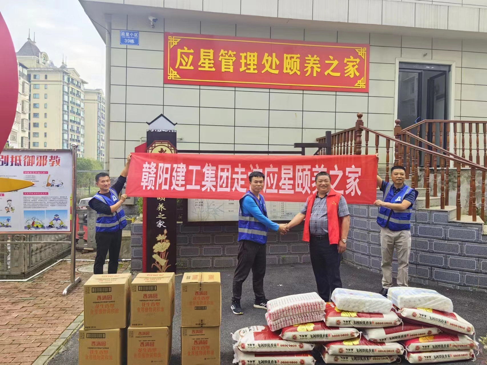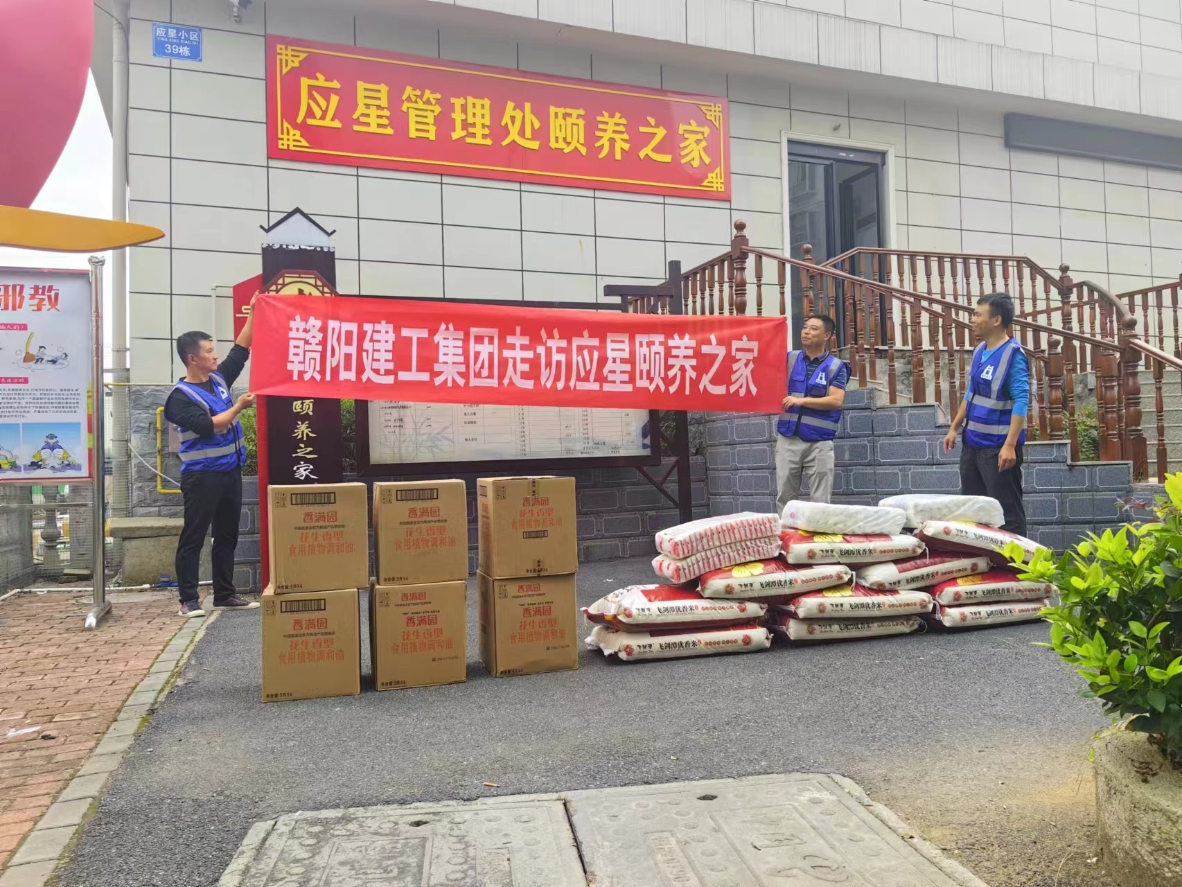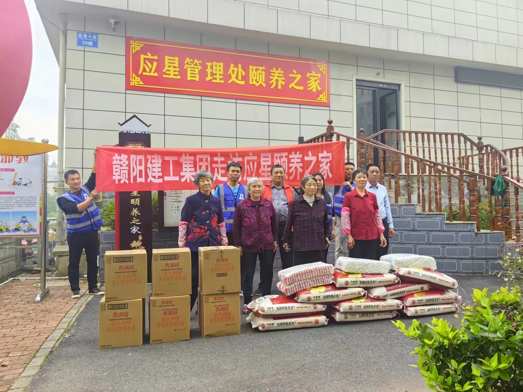 2023年10月25日赣阳建工集团有限公司新余市仰天大道人行道改造提升工程项目部人员走进新余市仰天岗应星管理处颐养之家,看望慰问老人同时送上大米、食用油、面条等爱心物资。颐养之家的领导代表接收慰问物资,并感谢赣阳建工集团有限公司的关心和支持。此次活动不仅营造了浓厚的尊老、敬老、爱老的氛围,还深深的温暖了长者们的心。