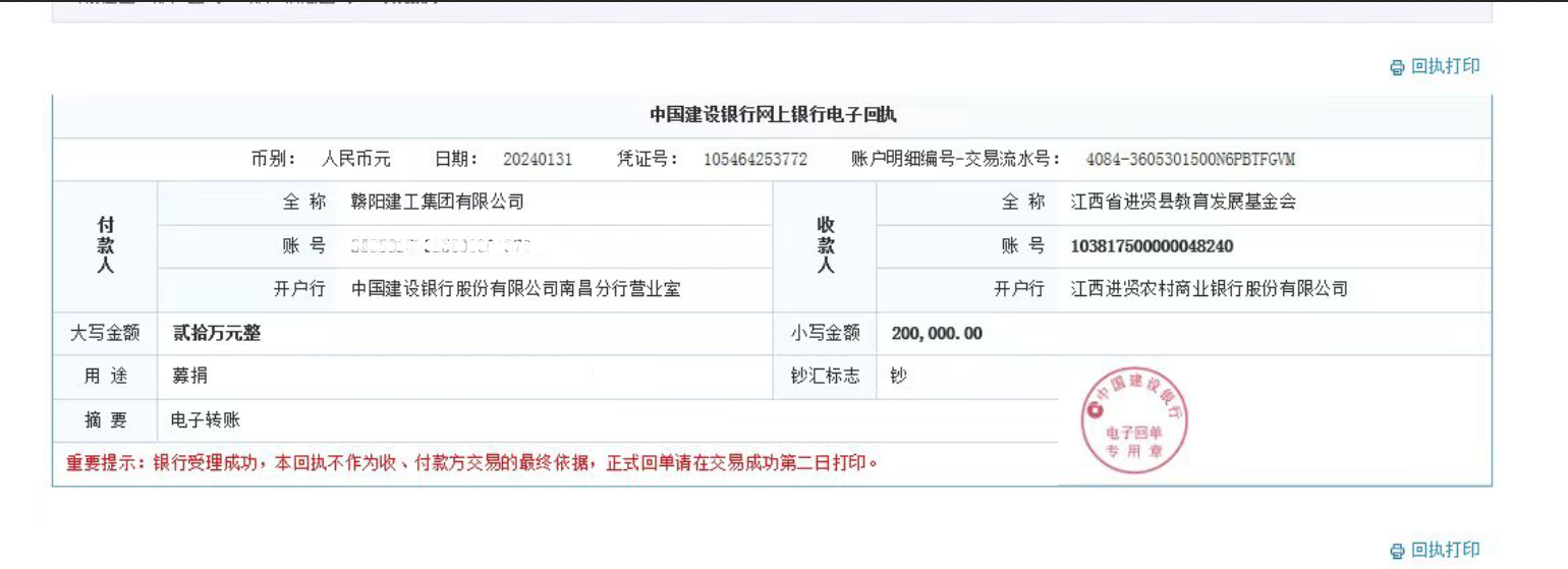为进一步支持江西教育公益事业发展,赣阳建工集团有限公司于2024年1月31日向江西省进贤县教育发展基金会捐献贰拾万元,以拳拳爱心为莘莘学子点亮希望之光。愿这份微薄的力量给教育带来对弱势群体的关注和关怀,减少教育差距;愿这份微薄的力量给教育带来积极的变革,激发学生的创新精神和求知欲望;愿这份微薄的力量给教育带来更加科学和系统的教学方法,提高教育质量。授人玫瑰,手有余香,助教兴学,播撒希望!