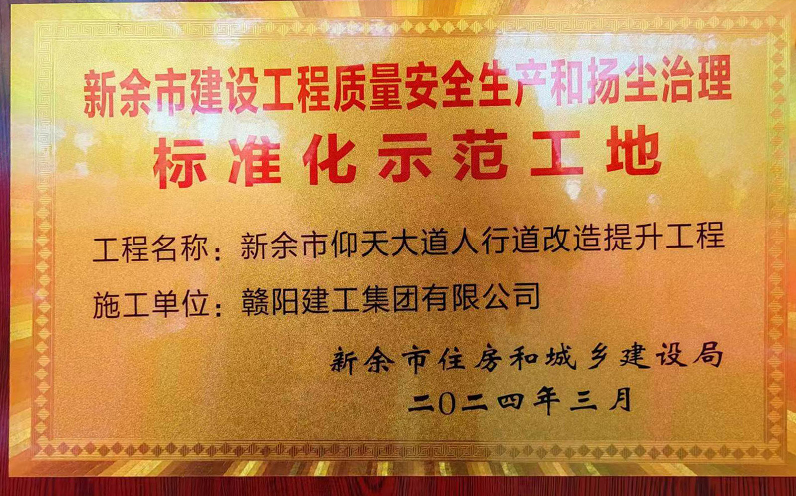 赣阳建工集团新余市仰天大道人行道改造提升工程荣获了2024年新余市建设工程质量安全和扬尘治理标准化示范工地