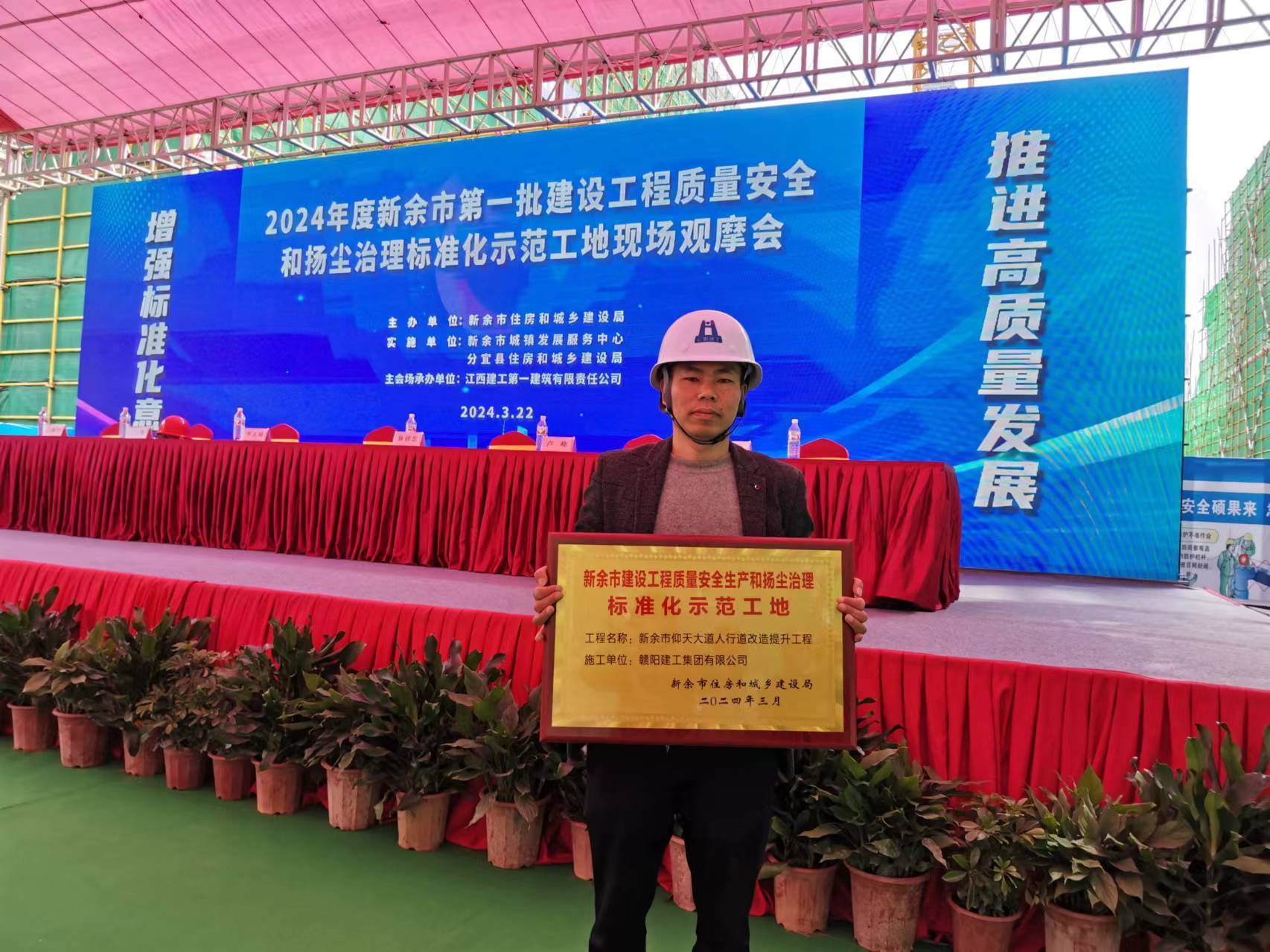 会上,各位领导围绕着“增强标准化意识,推进高质量发展”的话题发表了重要的讲话,且给获奖单位颁发了奖项。赣阳建工集团有限公司新余市仰天大道人行道改造提升工程有幸被授予了新余市建设工程质量安全和扬尘治理标准化示范工地!